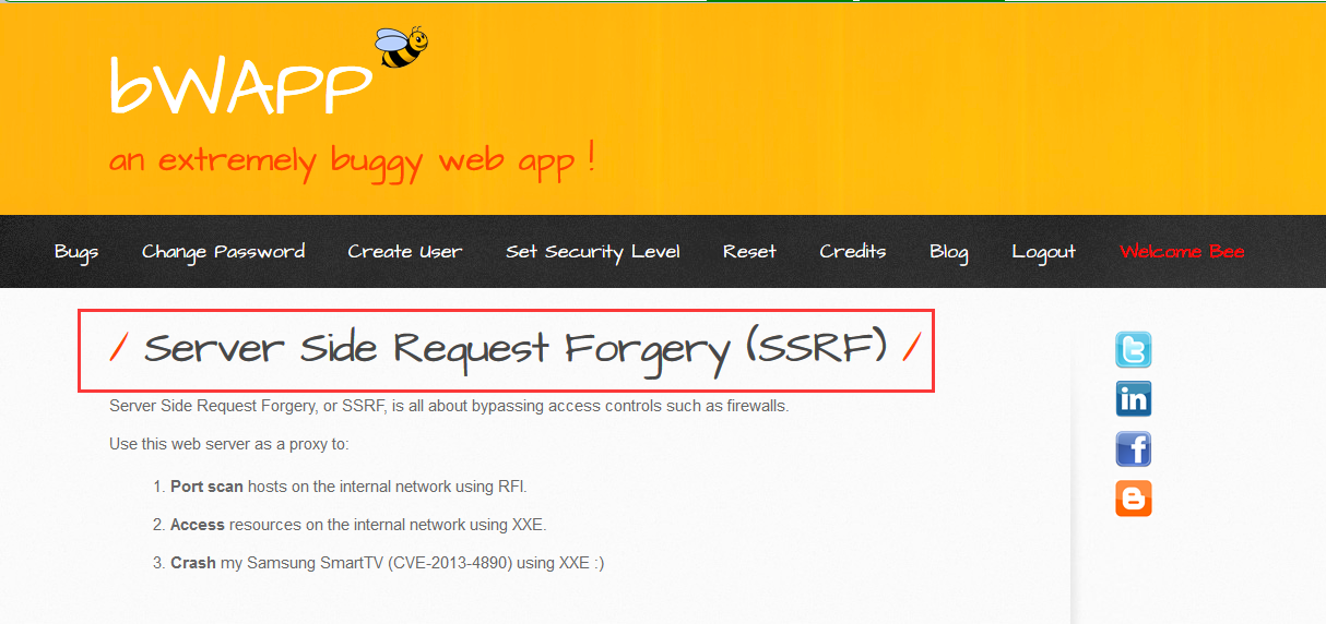 bWAPP中的SSRF给出了3个小实验来说明SSRF的利用场景: