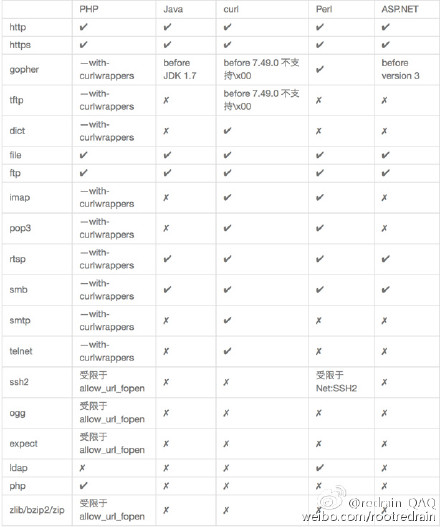 SSRF中各个编程语言可以使用的协议如下图所示: