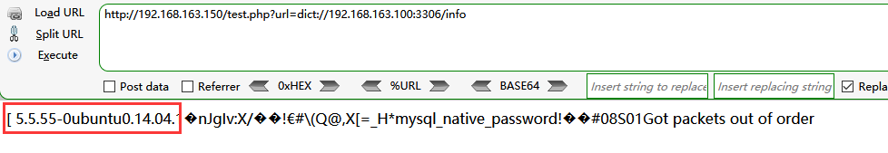 如请求http://192.168.163.150/test.php?url=dict://192.168.163.1:3306/info 可以获取目标主机的3306端口上运行着mysq-l5.5.55版本的应用。